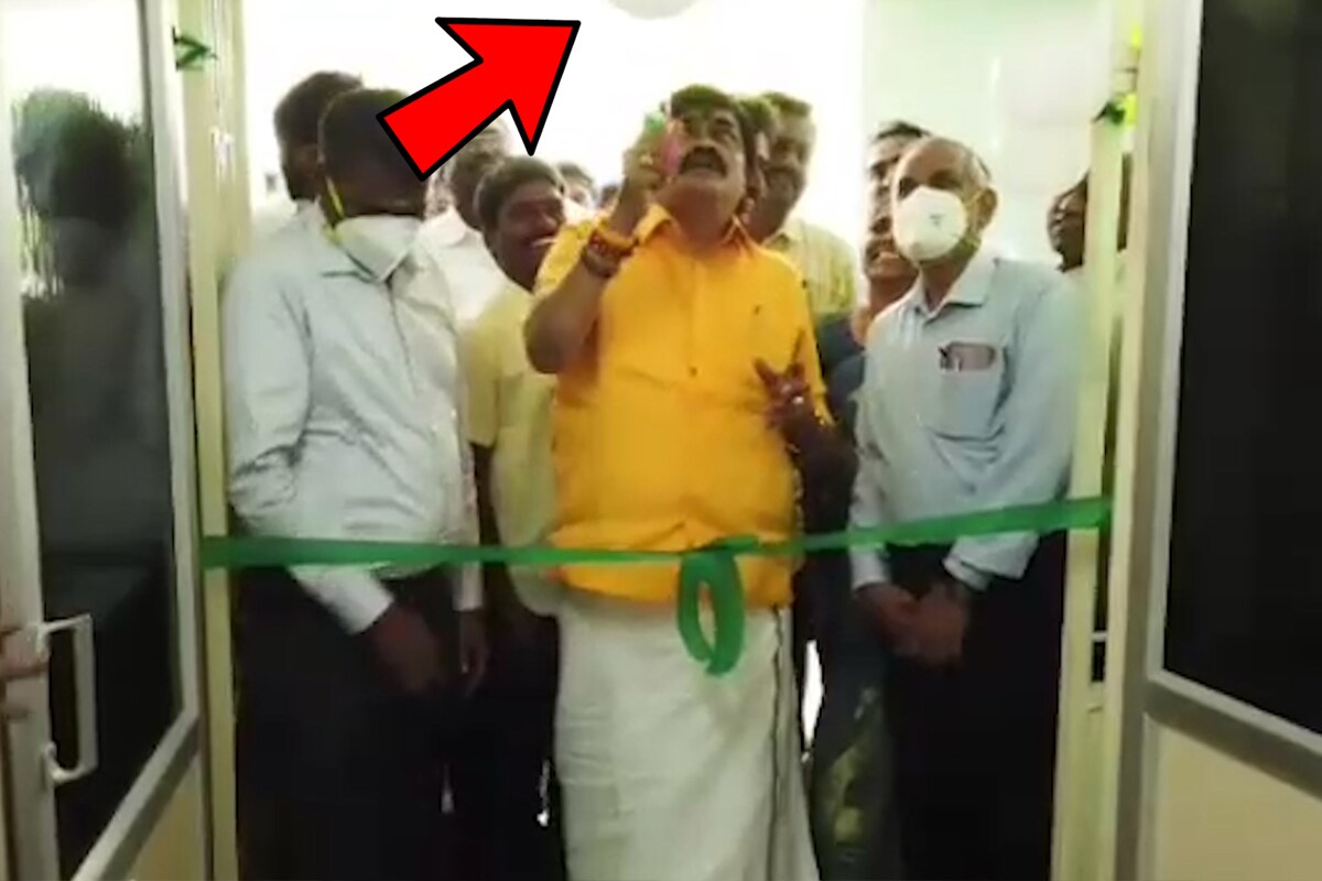 तमिलनाडु के मंत्री राजेन्द्र भालाजी ने शिवकाली में अम्मा मिनी-क्लिनिक का उद्घाटन करने पहुंचे थे. उद्घाटन के समय मंत्री जी अचानक गुब्बारे फोड़ने लग गए. जिला कलेक्टर और अन्य लोग रिबन काटने के लिए तैयार खड़े थे तभी मंत्री ने सजावट के लिए लगाए गए गुब्बारों को फोड़कर सभी को आश्चर्यचकित कर दिया.
